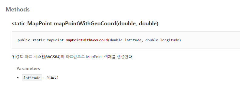 mapPointWithGeoCoord를 이용하고 해당 객체를 카카오 맵에 setMapCenterPoint 와 마커를 이용해 현재 위치를 표시해주었는데 mapPointWithGeoCoord 메소드를 살펴보니